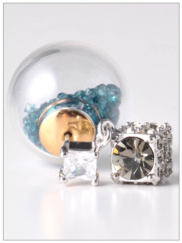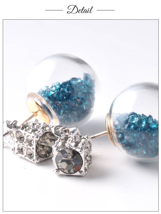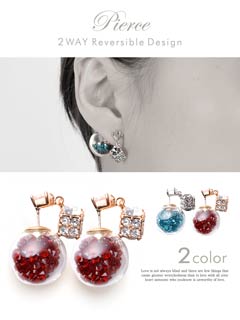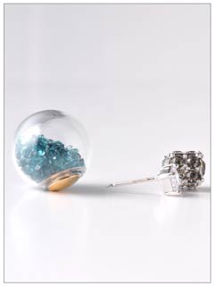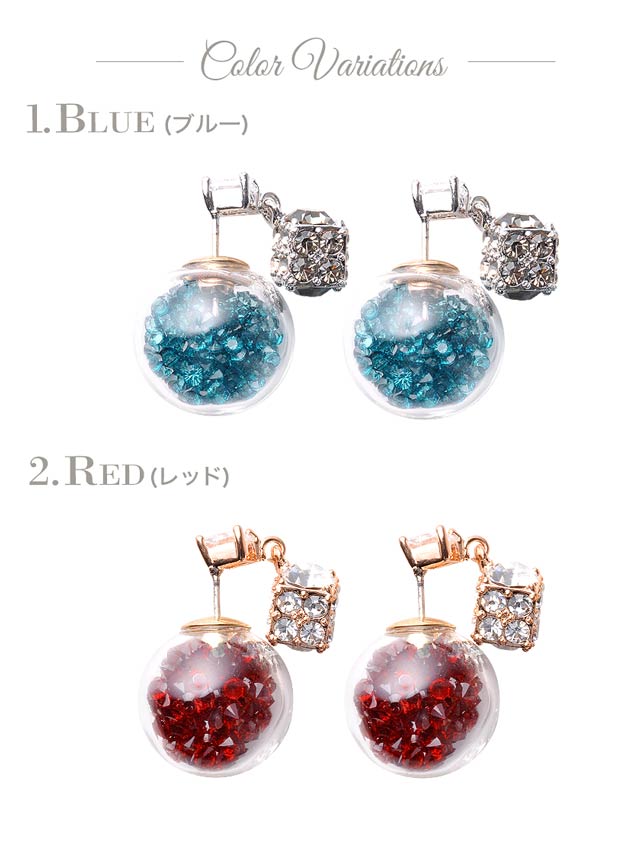 小さなガラスドームの中に煌くスワロフスキーを閉じ込めた可愛らしいピアス。 反対側のパーツはラインストーンを埋め込んだキューブが揺れます。 リバーシブル仕様で前後どちらでもお使いいただけます。
