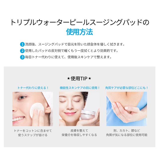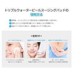 1.洗顔後、肌のキメに沿って顔全体をパッドでやさしく拭き取ります。目のまわりは避けてください。