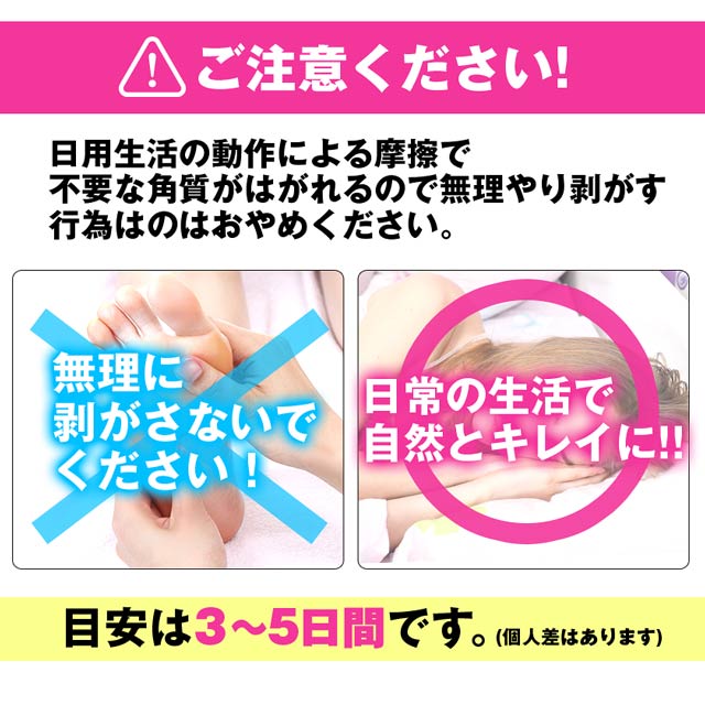 ○効果には個人差があります。1回のご使用で効果が得られない場合、初回使用時から4週間以上経過した後もう一度ご使用ください。 ○足パックをした後は必ず液を洗い流して乾かしてください。