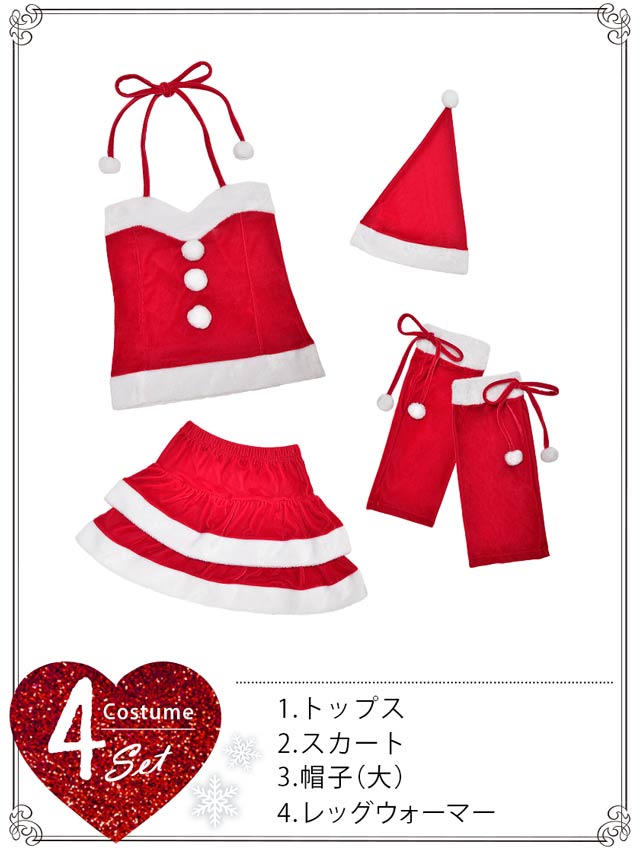 着心地楽ちんサンタキャミ&スカートに帽子がついた4点セット。キャミにはころんとしたCUTEなポンポン付き♪スカートは2段のティアードフリルでふんわりシルエット。ウエスト部分はゴム仕様なのでパーティーで食べ過ぎちゃっても安心♪サンタ帽子は被った時に小顔に見えるようにボア部分の幅が広めに設計されています。レッグウォーマーにもリボン×ポンポン付き♪こだわりの詰まったオリジナルセットになっています。