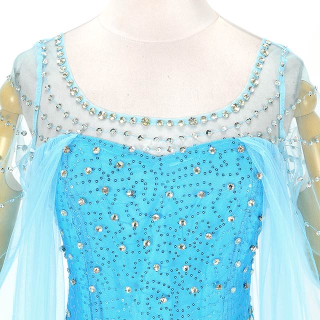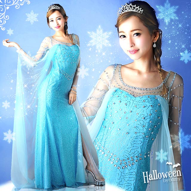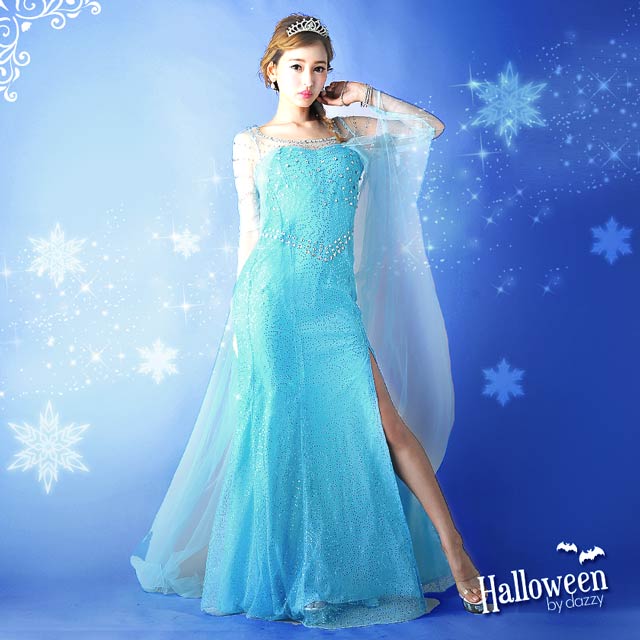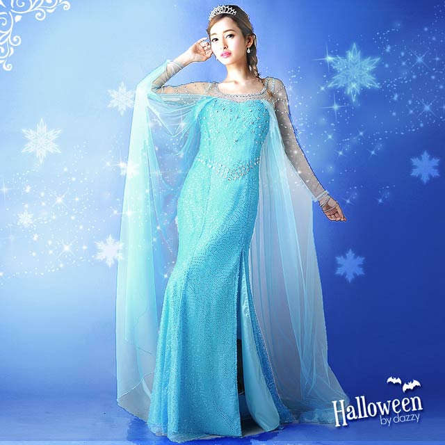あの大HIT映画『アナと雪の女王』のエルサ風コスチュームが登場!!映画さながら、エルサの輝かしいオーラと透き通るようなブルー色は思考を重ねて極限まで再現した自信作です!!全体にビジューとスパンコールを散りばめて、360°どこから見てもキラキラ☆デコルテは透けチュール、透けベールのマントがついて女王の貫禄もバッチリッ♪美脚が見え隠れするスリット入りです☆他店10000円越えの商品がDRWなら