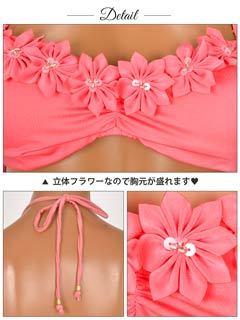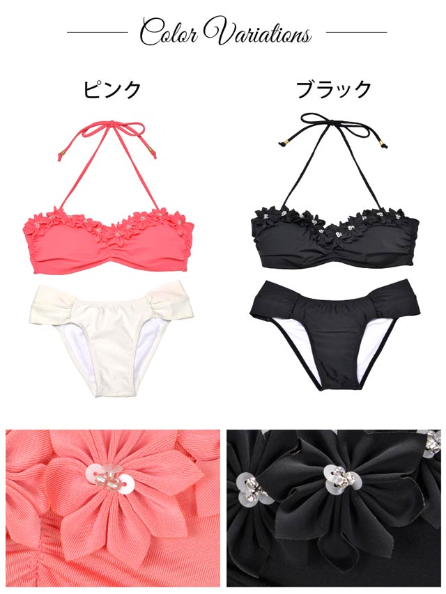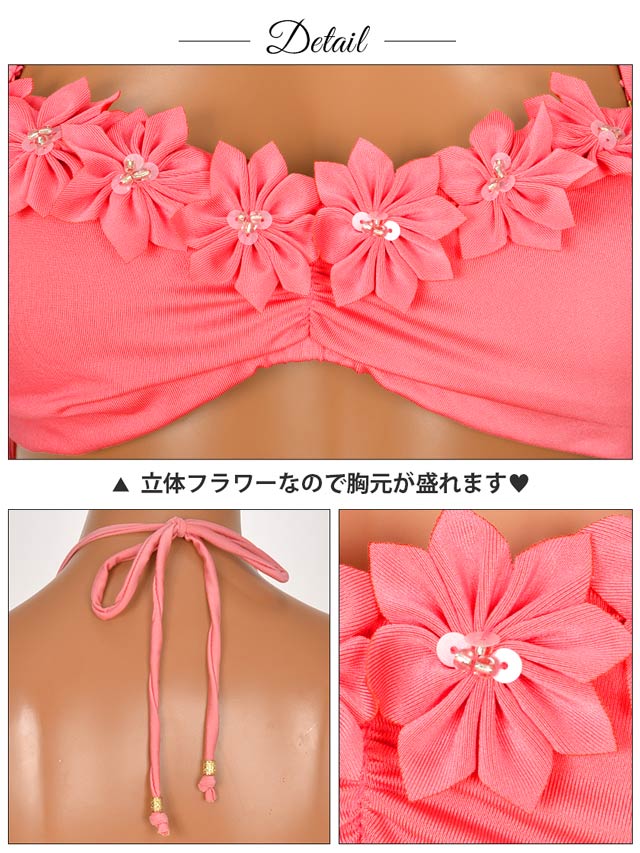 胸元に咲かせた立体フラワーにビーズでさらに輝きと高級感をプラス♪ショーツサイドはくしゅっとしたデザインでシンプルながらも周りと差がつくハイセンスな着こなしができるデザインです!ホルター部分は取り外しが可能なので、お手持ちのホルターストラップと変更することもできます!年上カレとのデートはこの水着で大人っぽさをアピールして☆