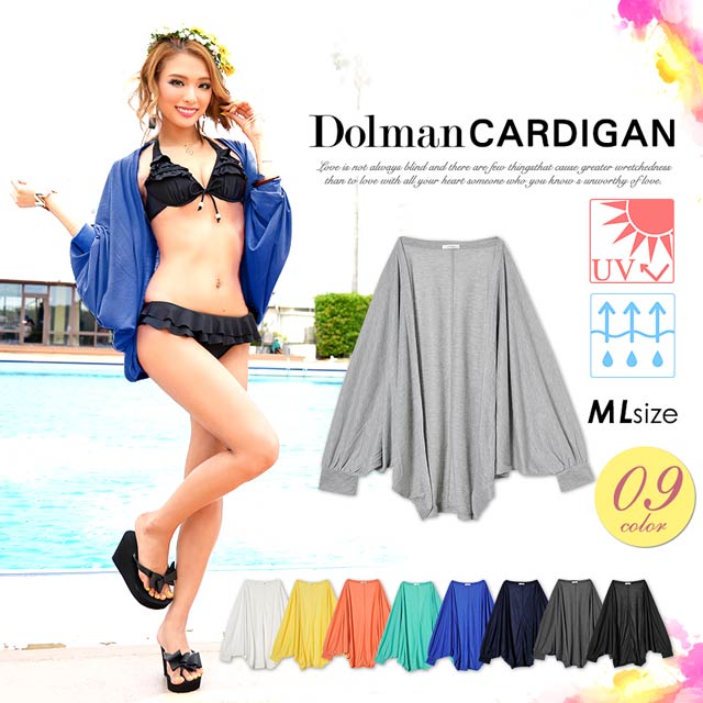 着るだけで紫外線カットしてくれる女子の味方のカーディガン登場♪水着に合わせてビーチでも大活躍間違いナシ!!誰でも羽織りやすいドルマンデザイン♪とっても軽くてさらっと着れるので使い勝手抜群です♪ 着てるだけでお洒落コーデ完成★紫外線もカットできる優秀カーディガンです♪