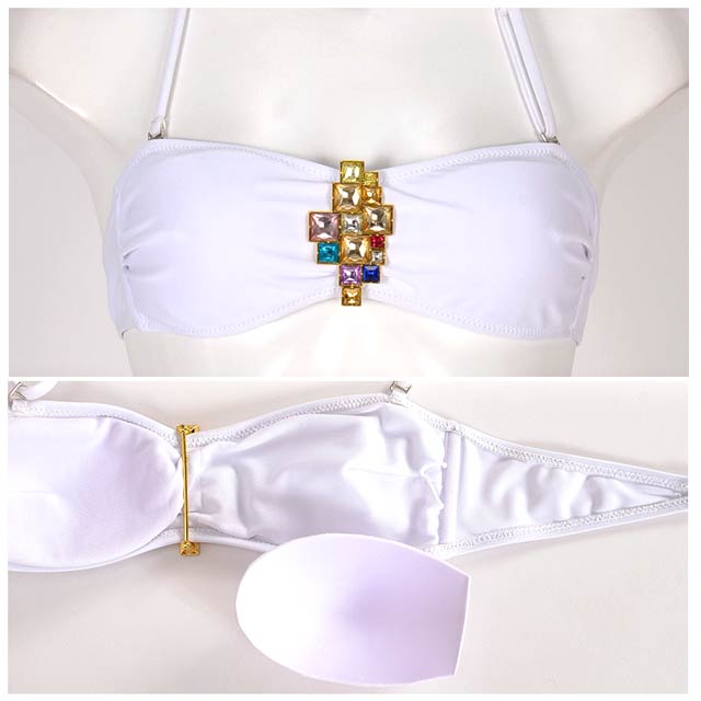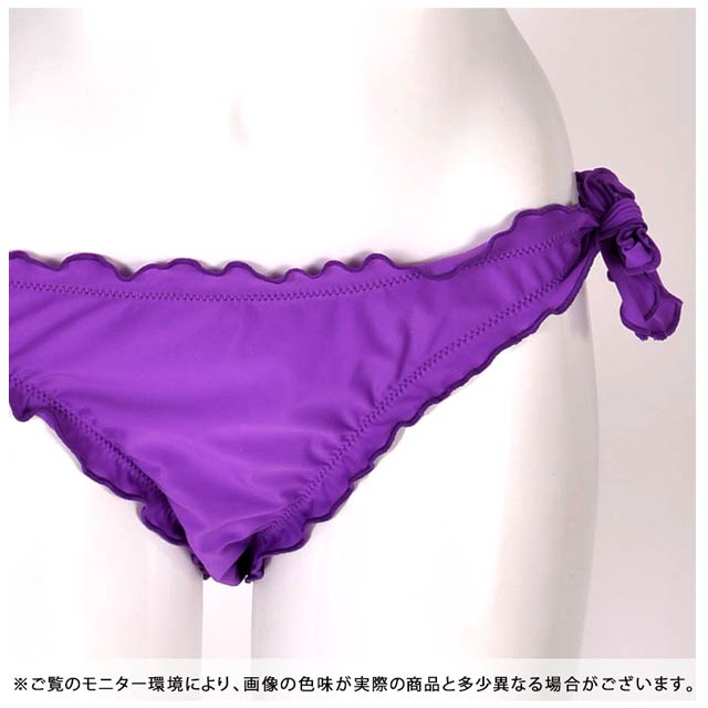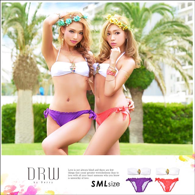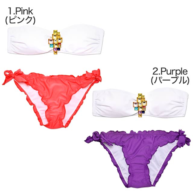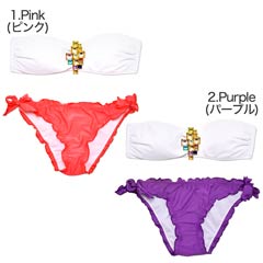 フロント部分に豪華なビジューをデコレーションした使いやすさ◎な水着が登場!!ワンカラーにストーンだけを飾り、ストーンの存在感が際立つデザインは年齢層問わず着て頂けるアイテムです!ショーツは女の子らしさ全開でたっぷりのフリルをあしらいちゃっかり体系カバーもできちゃうポイントに♪♯゜サイドははらりとほどける紐パンを採用して男心をくすぐるポイントもしっかりキャッチ!お手持ちの水着と組み合わせて自分だけのオリジナルコーデを組めばビーチでも目立つこと間違いなしです☆