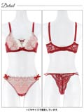 リボンと冬っぽい刺繍がポイントのキュートなランジェリー。たっぷりなレースがかわいさを演出してくれます◎脇高設計で胸元をきれいにキープ♪バック透けショーツで後ろ姿も素敵にしてくれる一着です。