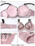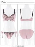 リボンや編み上げ風の刺繍を施し、地雷系な可愛さをたっぷりと詰め込んだランジェリー。フロントのハート型チャームやアンダーにひらめくフリルが女の子らしい甘さをプラス♪ショーツはほどけるサイド紐仕様で、可愛いだけでなくちょっぴりセクシーなデザインです◎