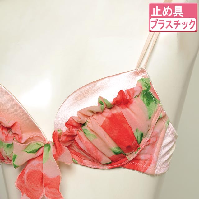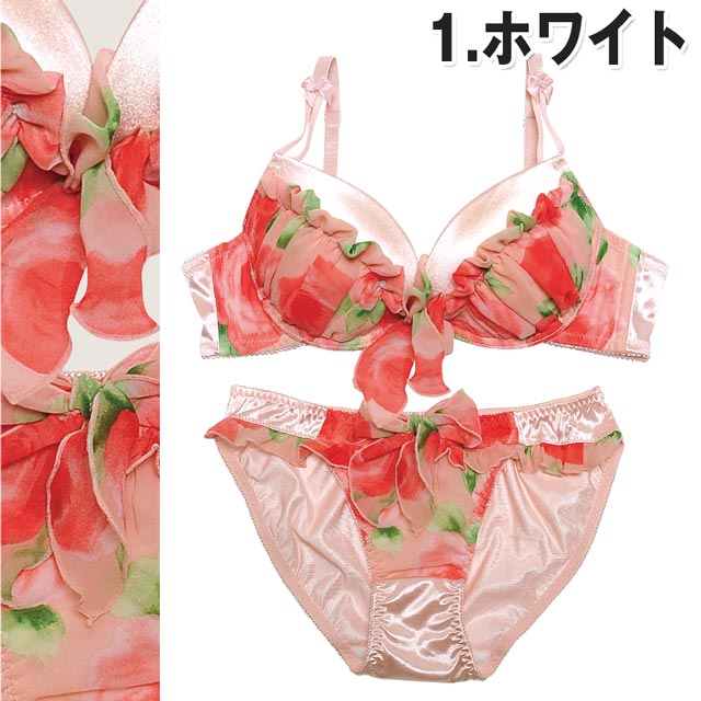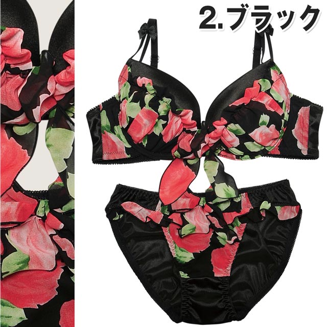 胸いっぱいにひろがるROSE柄が上品に♪シフォン生地のフリルで胸元を可愛く(●´ω`●)☆センターには存在感のある大きいリボン付き♪ストラップにはCUTEなミニリボン付きでその下からは2重になっているので脇肉を一気に寄せて上げられる優秀ブラ☆ショーツも同じROSE柄シフォンでセンターにはリボン♪サイドにかけてひらひらのフリルがCUTEに演出☆ブラもショーツも後ろはサテン素材なのでスッキリしたバックスタイルにッ♪パッドは超厚い内蔵パッドなので綺麗な谷間の完成!!高級感抜群の上品オーラを放出させてッヽ(*゜∀゜*)ノ!!